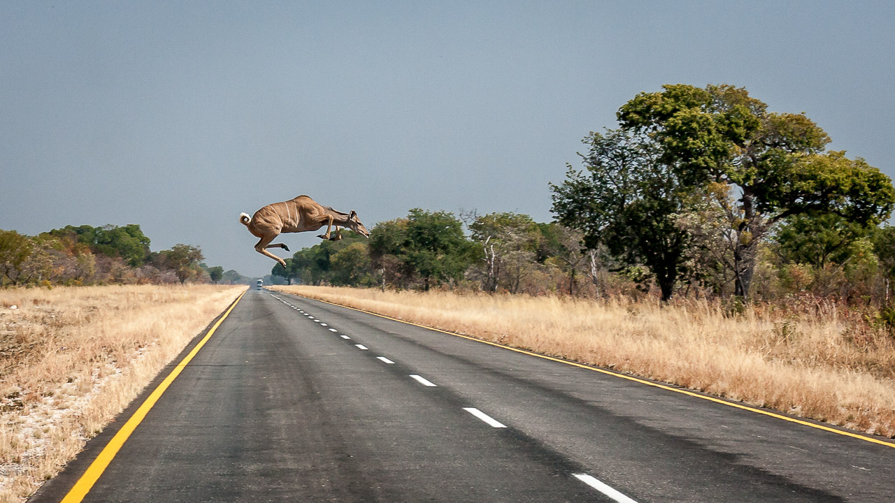 20.7.: Nambwa --> Divundu. Ein Kudu kreuzt! ( 55 mm 1/250 Sek. bei f / 8,0 ISO 400 )