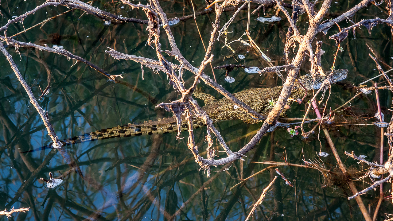 22.7. Sunrise Tour auf dem Kavango - Krokodil-Baby ( 73 mm 1/60 Sek. bei f / 8,0 ISO 800 )