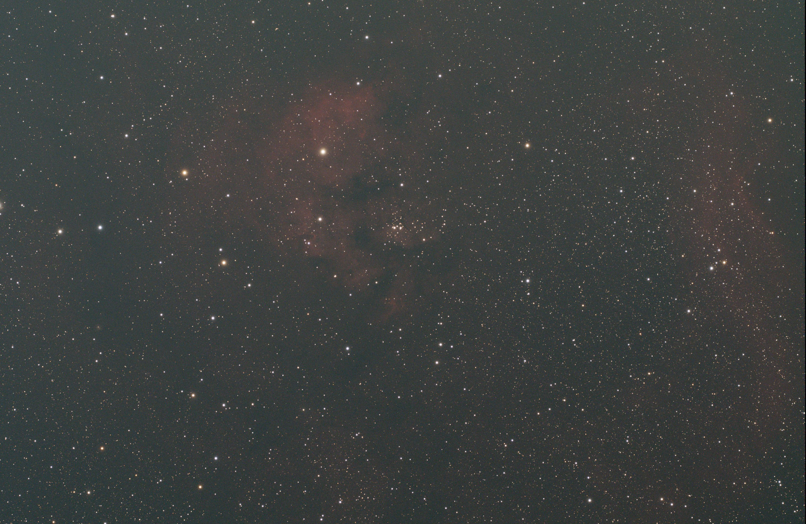 Dadurch kann man die Farben in drei Mono-Bilder trennen: Ha, SII aus den roten Pixeln und OIII aus den grünen und blauen. Wie mit einer Monokamera mit Narrowband-Filter – da man aber nur ½ – ⅓ der Pixel je Farbe hat, muss man mit einer Farbkamera viel länger belichten.