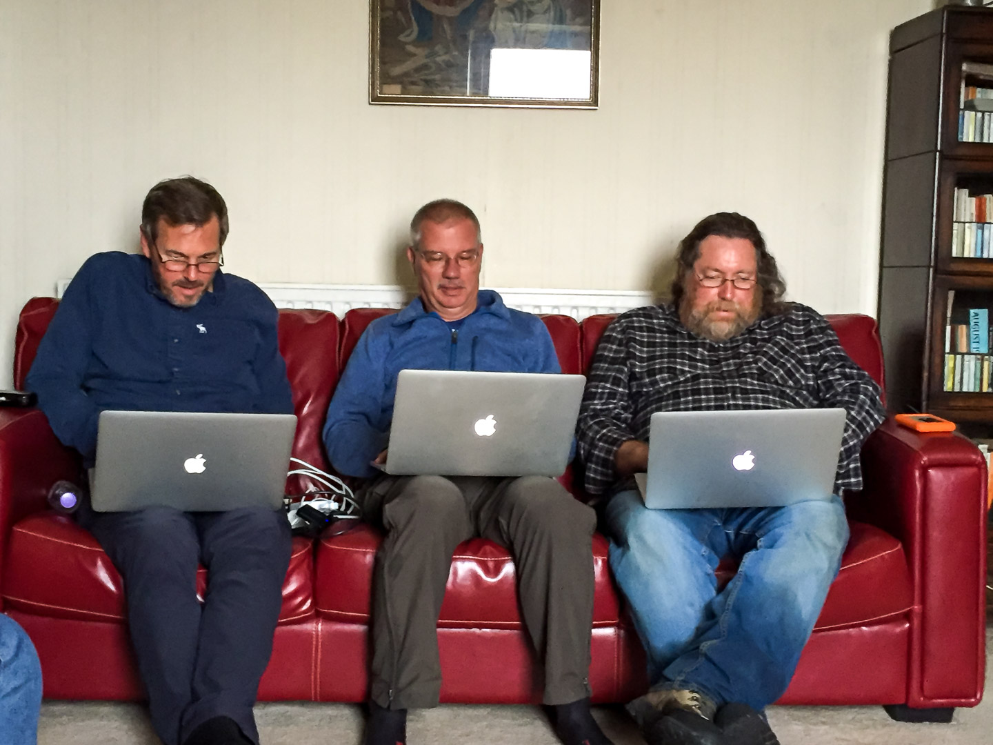 … besteht aus vier Engländern (von denen einer aber seit Jahrzehnten in Frankreich lebt), einem Schotten (der als Kind nach Australien auswanderte), mir (dem Deutschen) und Tom (Amerikaner aus dem mittleren Westen, aber seit Jahrzehnten in England). Also 6x British Correctness vs. 1x German Directness ;-).